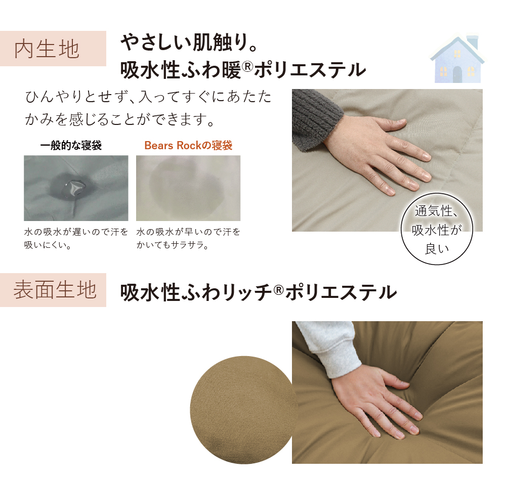 内生地には、ひんやりとせず、入ってすぐにあたたかみを感じる「吸水性ふわ暖®ポリエステル」を使用。