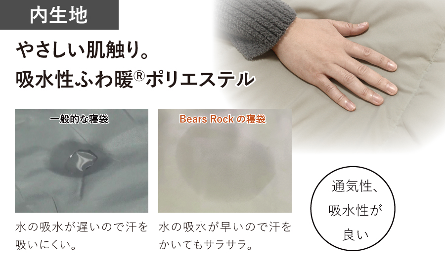 内生地には、汗をかいても蒸れにくい「吸水性ふわ暖®ポリエステル」を使用。ふんわりしていてぬくもりを感じ、「布団に入ったときのヒヤッと感」が少ないのが特長です。