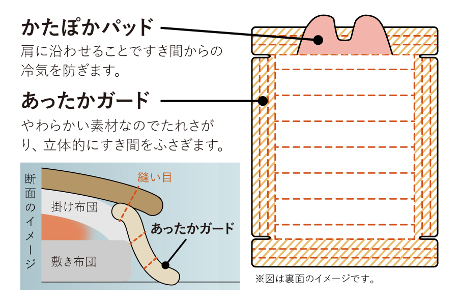 『かたぽかパッド』と『あったかガード』ですき間をふさぐので冷気が入らず、布団の中がずっと暖かいままです。 暖かさをため込むので朝までぐっすり眠れます。夜中や朝方に寒さで目が覚めてしまう方におすすめです。